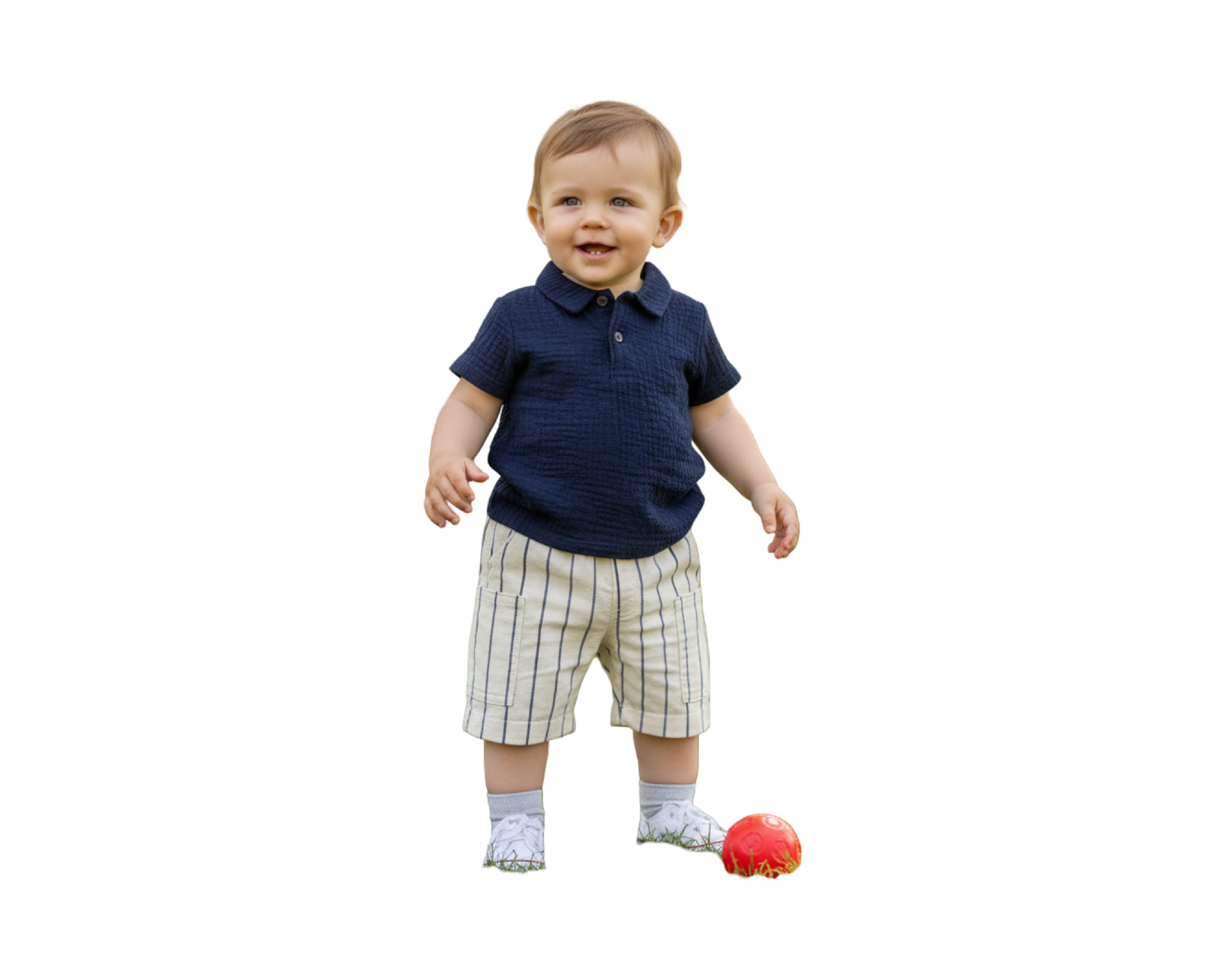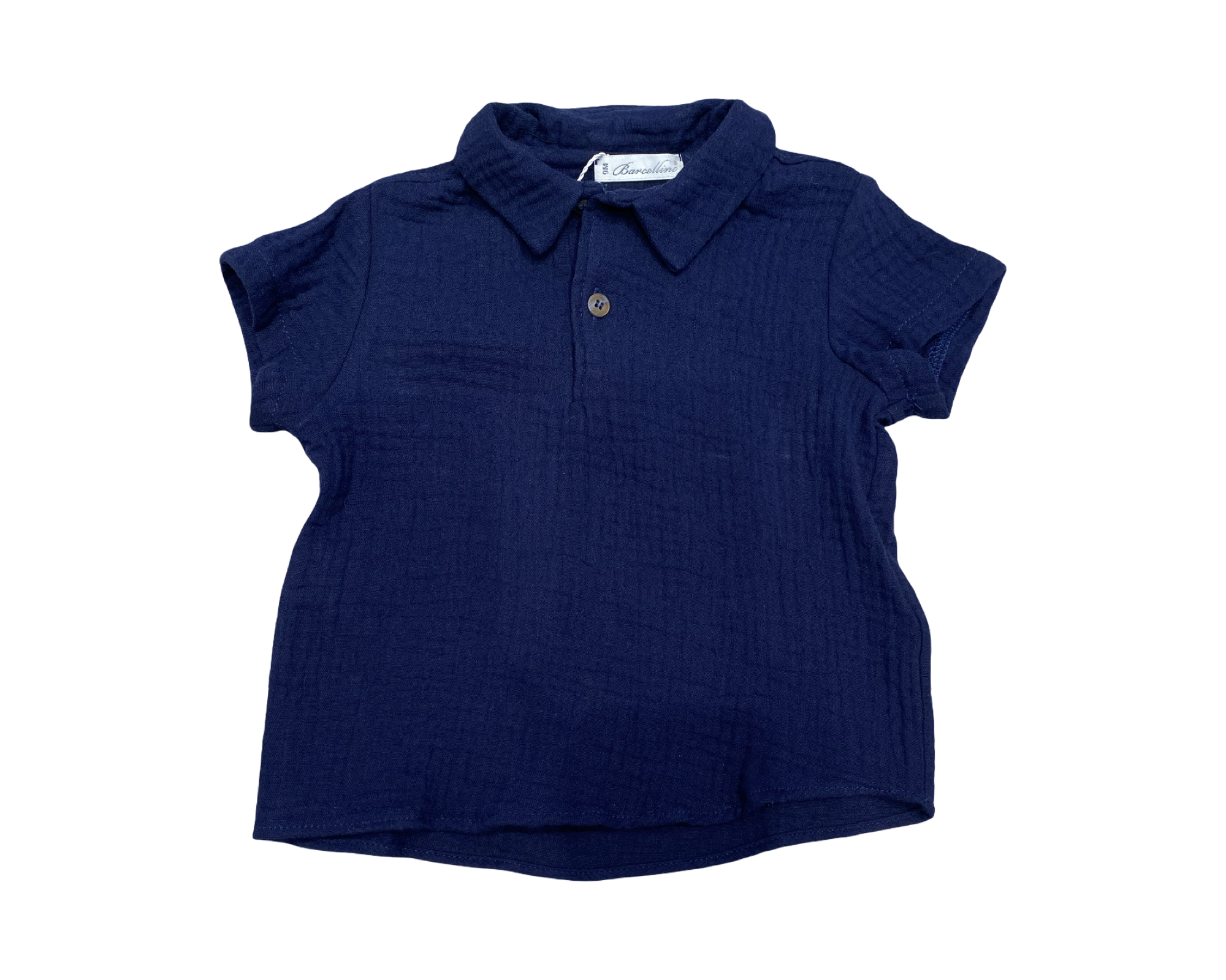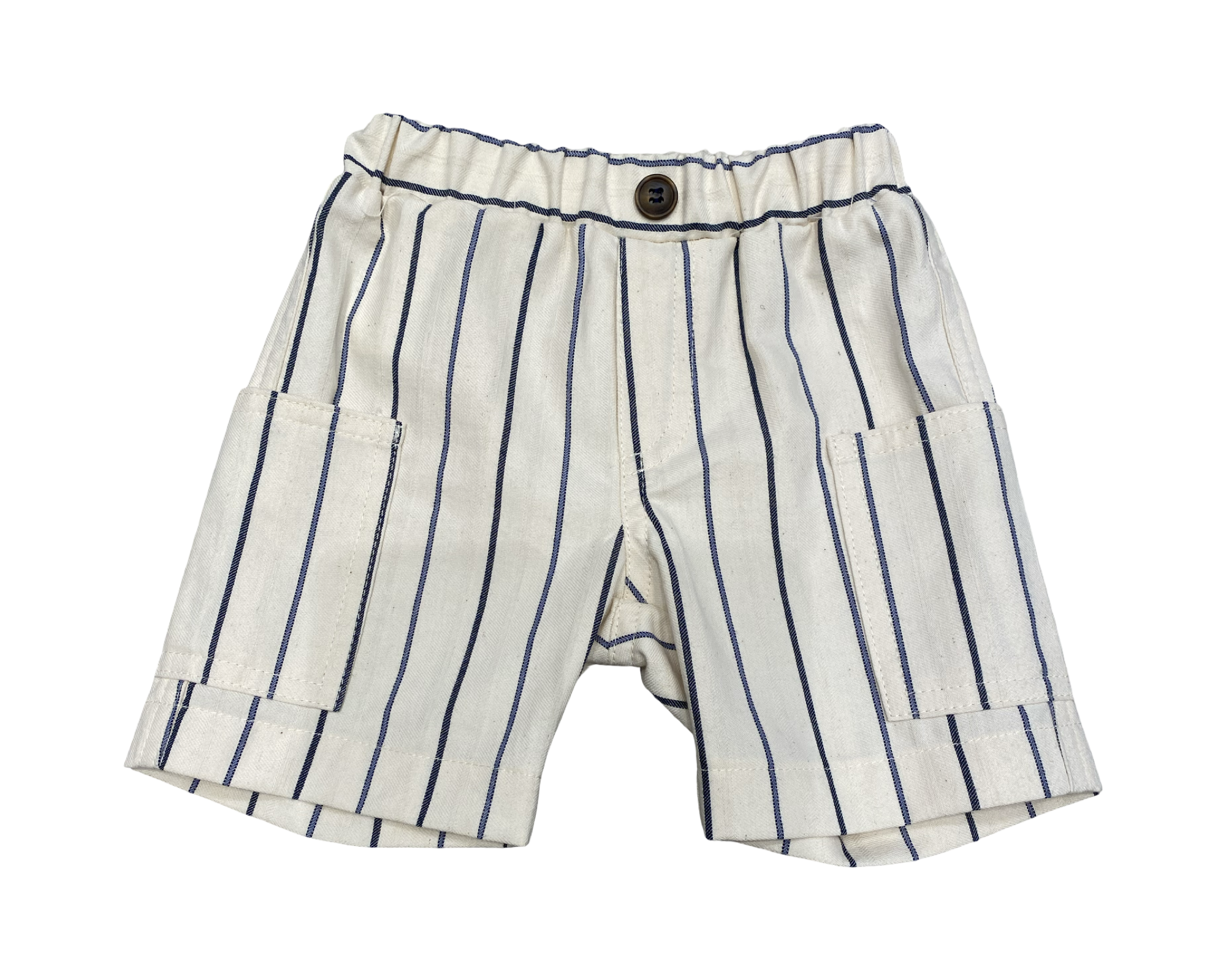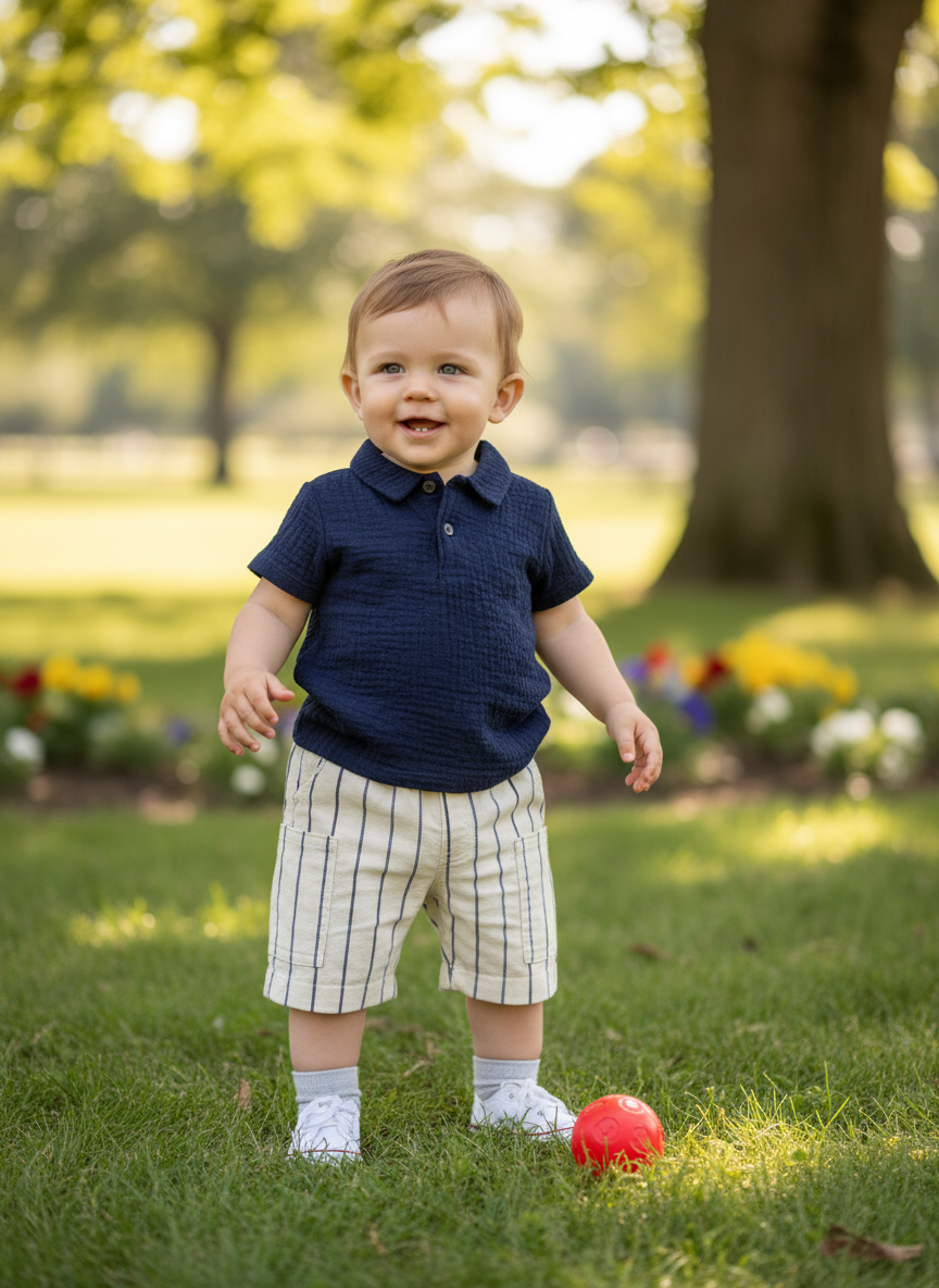 Completino baby estivo composto da polo in mussola di puro cotone variante blu + short gessato largo, tasconi laterali, vita elasticizzata, in morbido tessuto di cotone e viscosa.