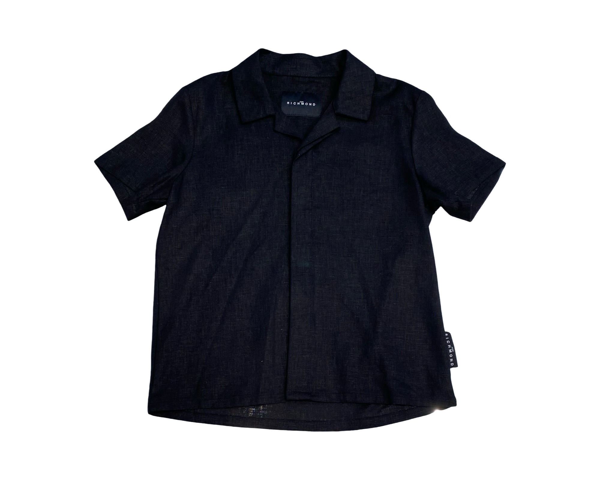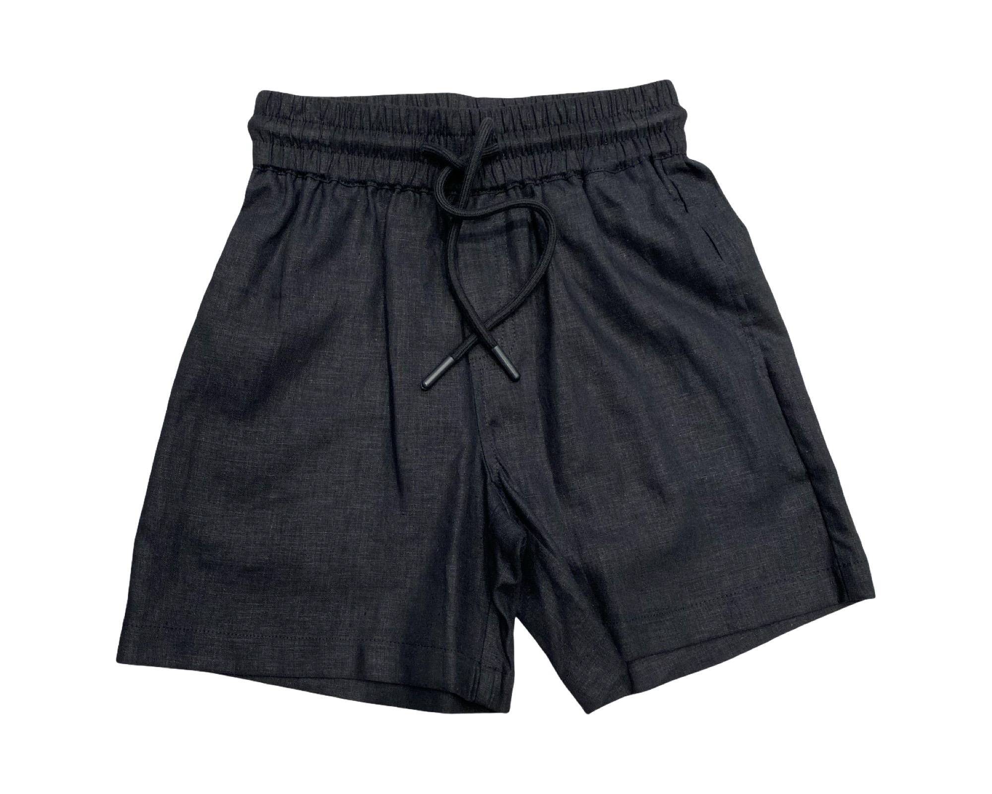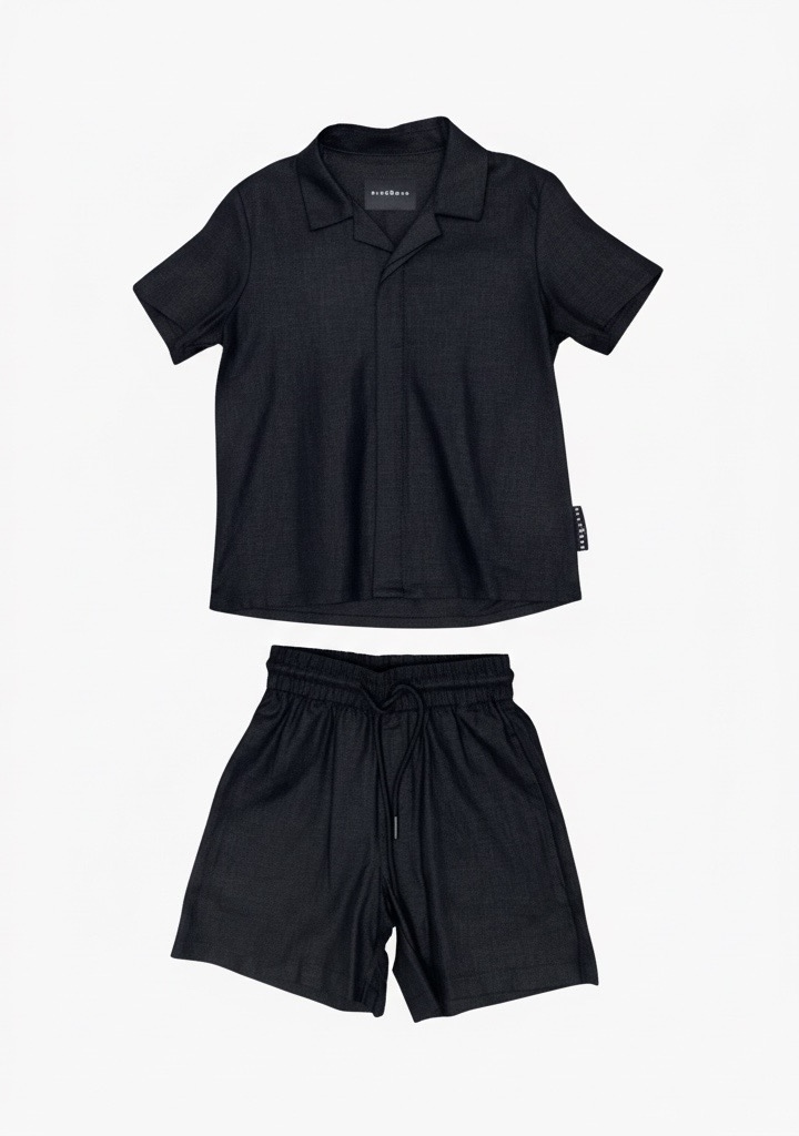 Completo baby nella variante Nera composto da camicia scollo a V e bottoni nascosti + bermuda con vita elasticizzata e regolabile con laccetti.