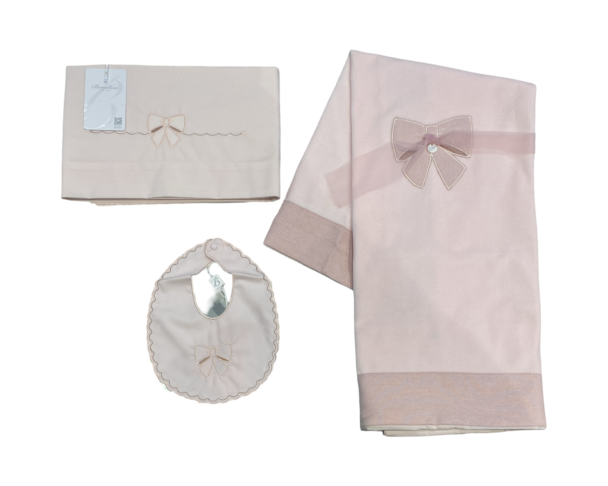 Set culla o carrozzino composto da copertina in ciniglia sfoderabile – apertura sul retro per permettere di inserire un imbottitura – 3 pz lenzuolino ( con sotto e federa ), infine anche la bavetta del tema.