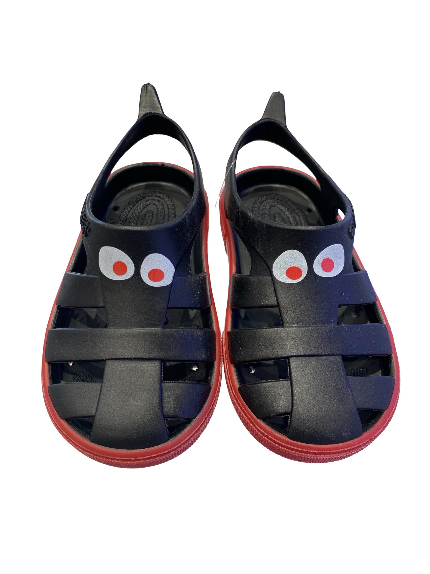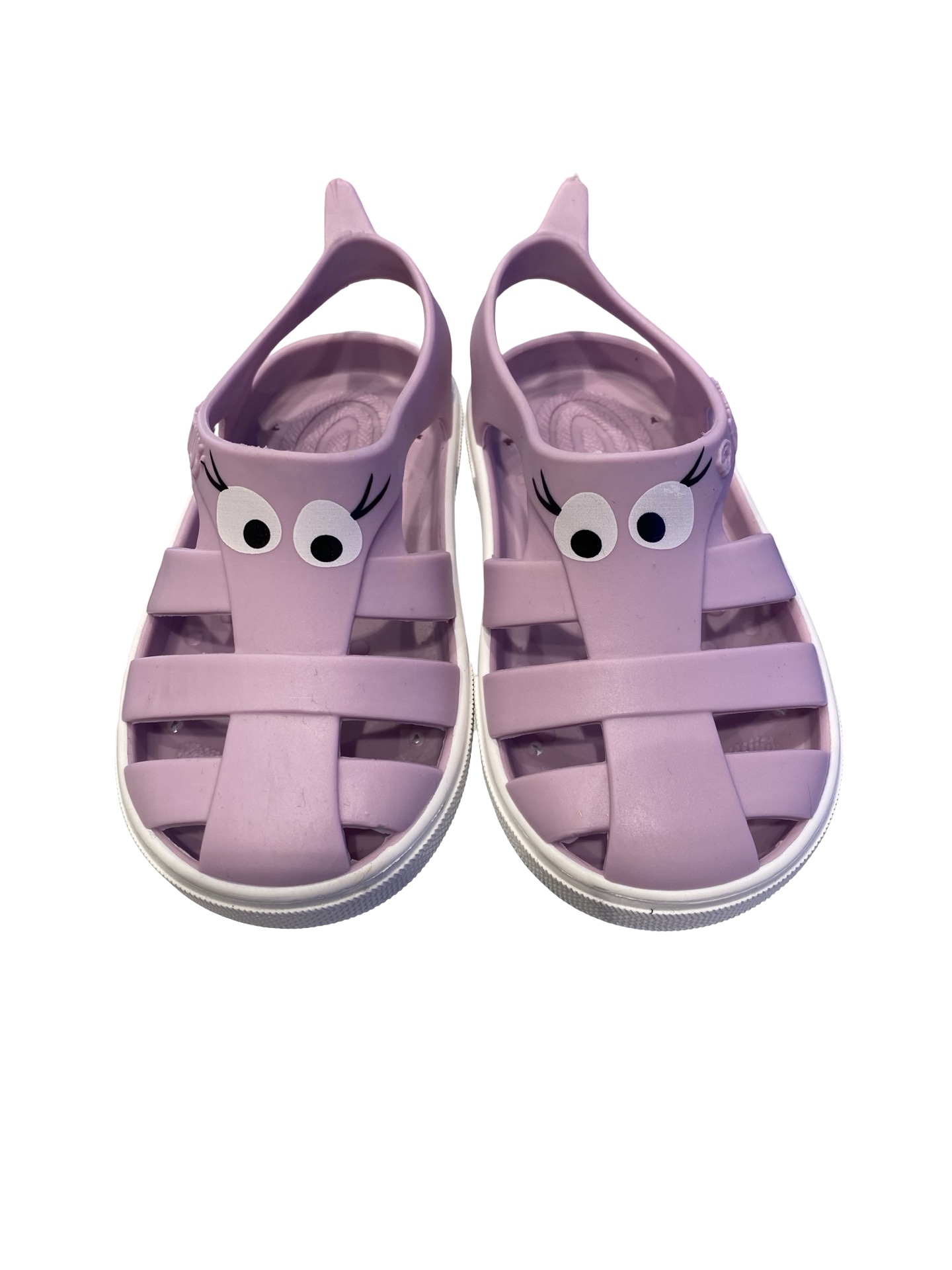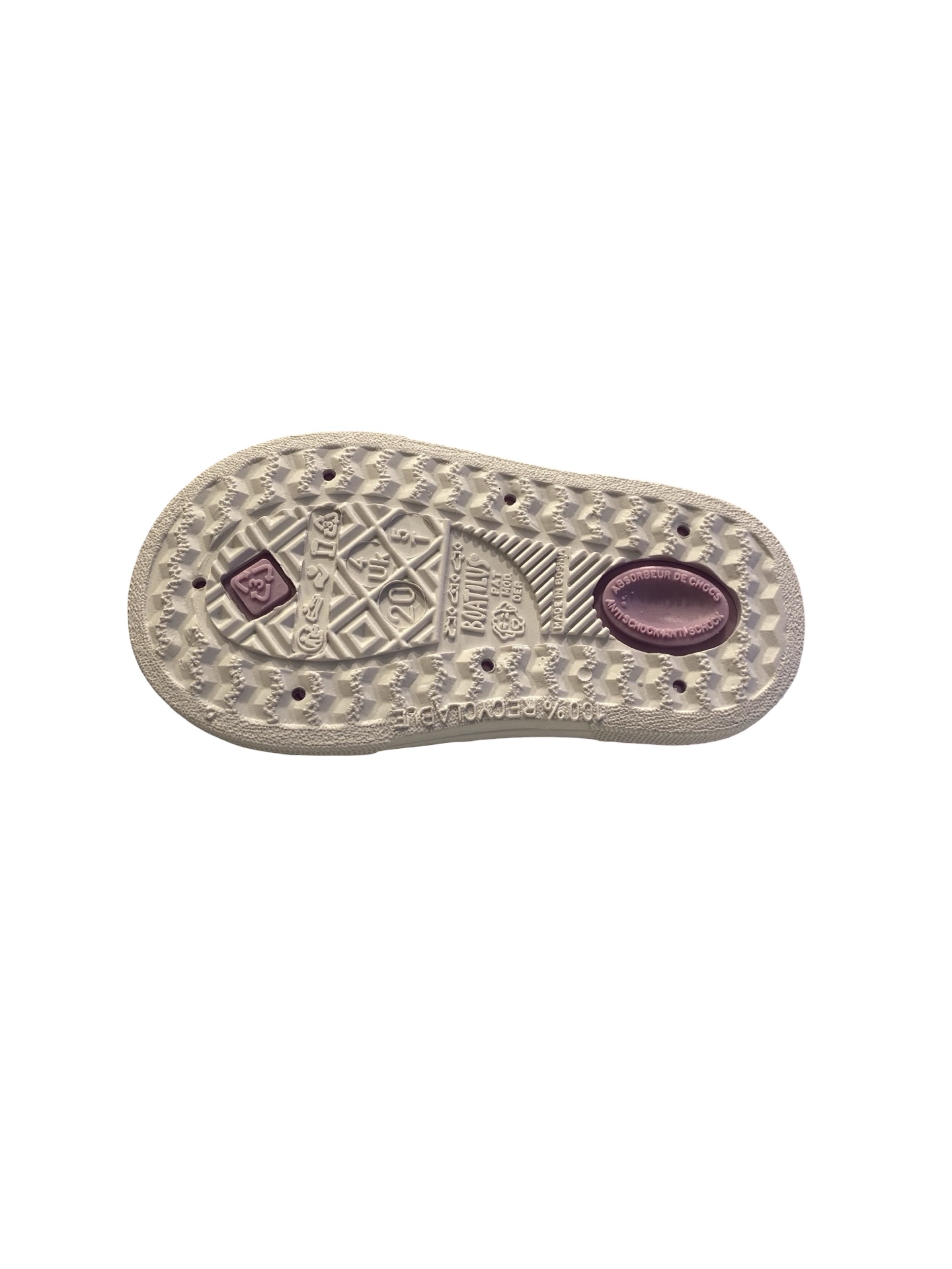 Linea di sandali profumati e ultra-flessibili, forma ergonomica con sistema anti-shock nel tallone, particolare del decoro di occhietti sul davanti, create per essere riciclate.