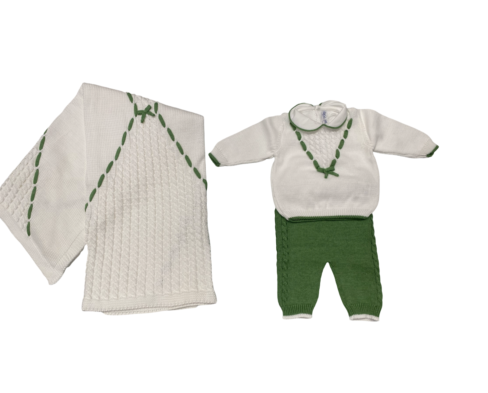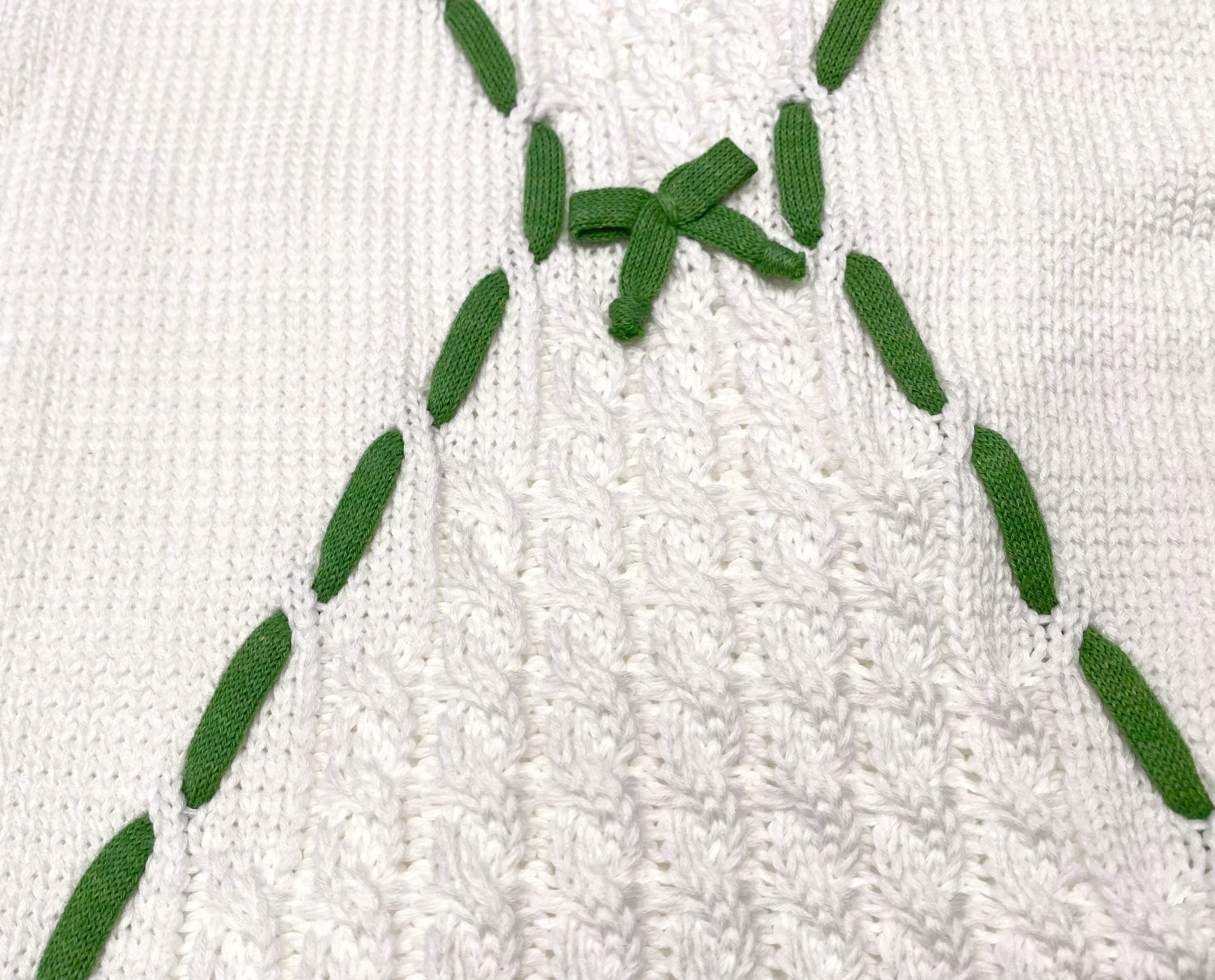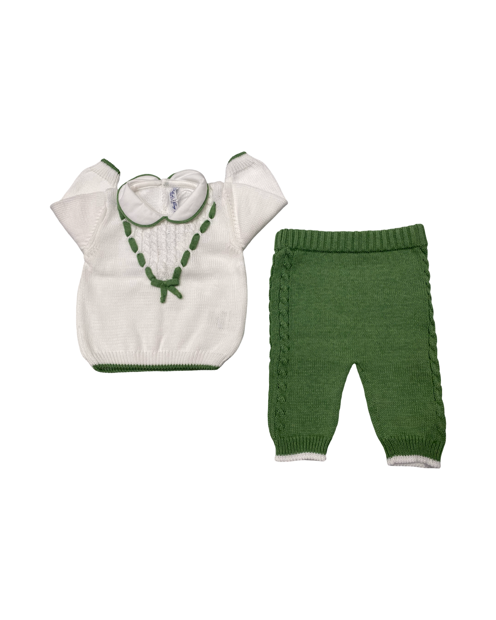 - Completino 2 pz. in filo di cotone, inserto sul davanti di lavorazione a trecce con passanastro e piccolo fiocco verde, bottoni sul retro e sul cavallo.Colletto in piquè di cotone